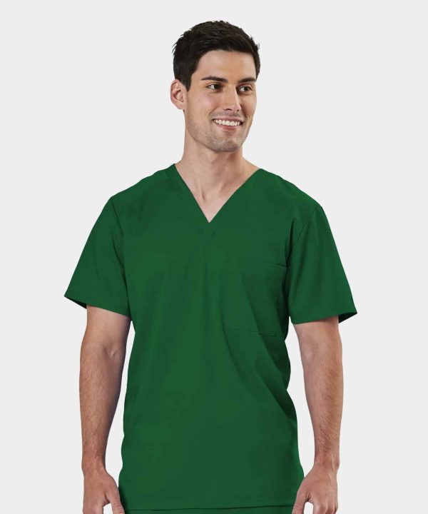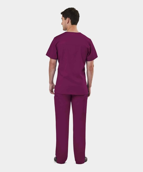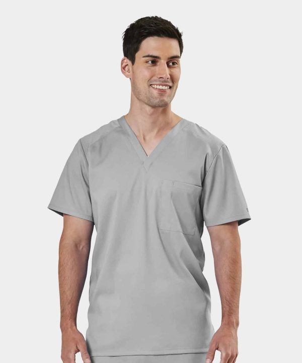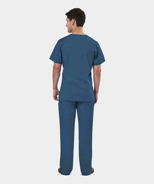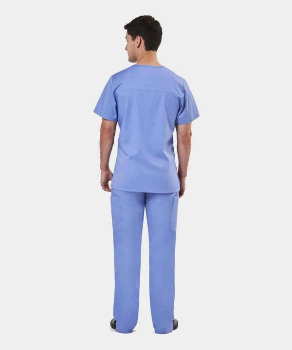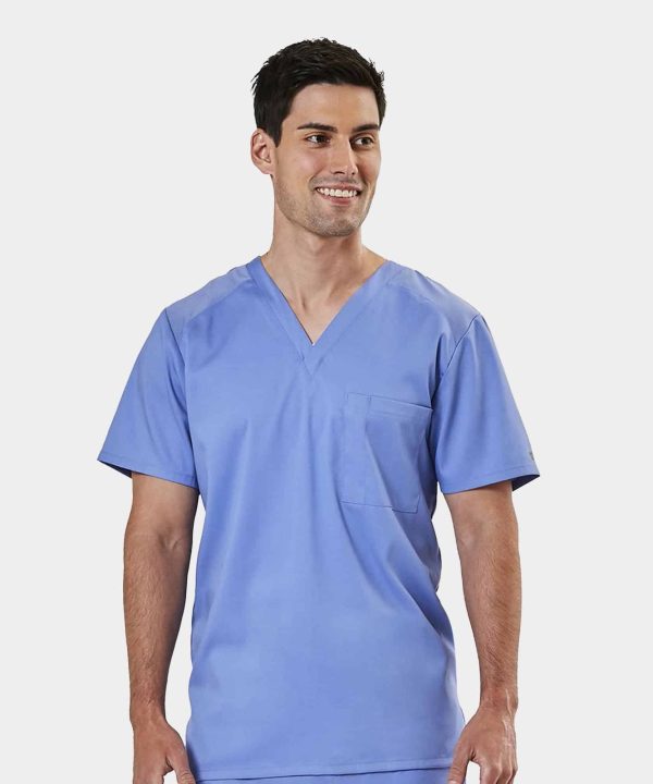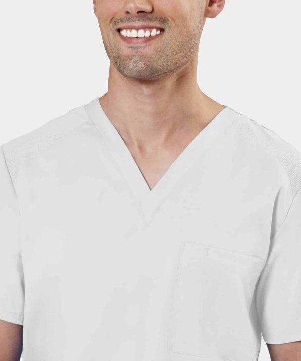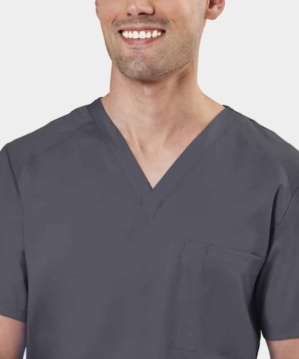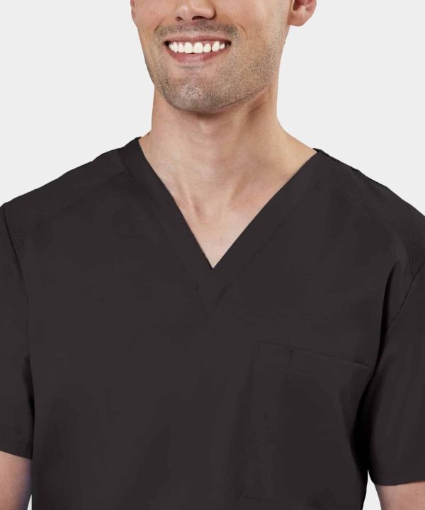 Looking for a comfortable and stylish scrub top? Check out this men’s v-neck scrub top! With a chest pocket and pen slot, curved mesh panel at the shoulder, back yoke, and side vents, this top has everything you need. Plus, the fabric is a blend of polyester, rayon, and spandex for ultimate comfort and flexibility. Get yours today and feel great at work!