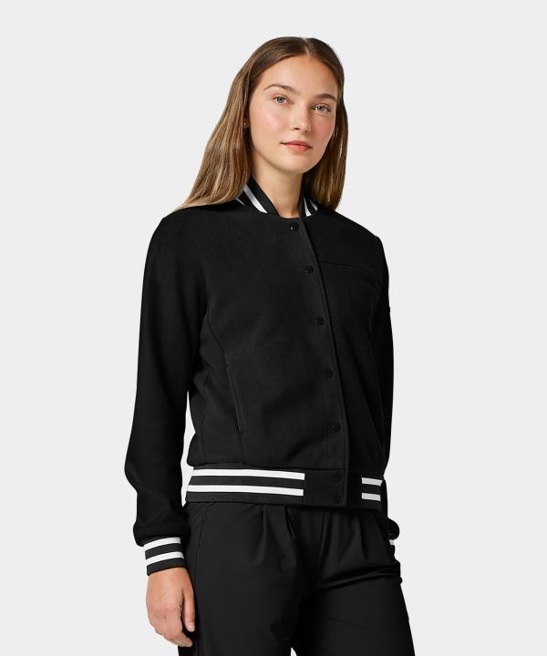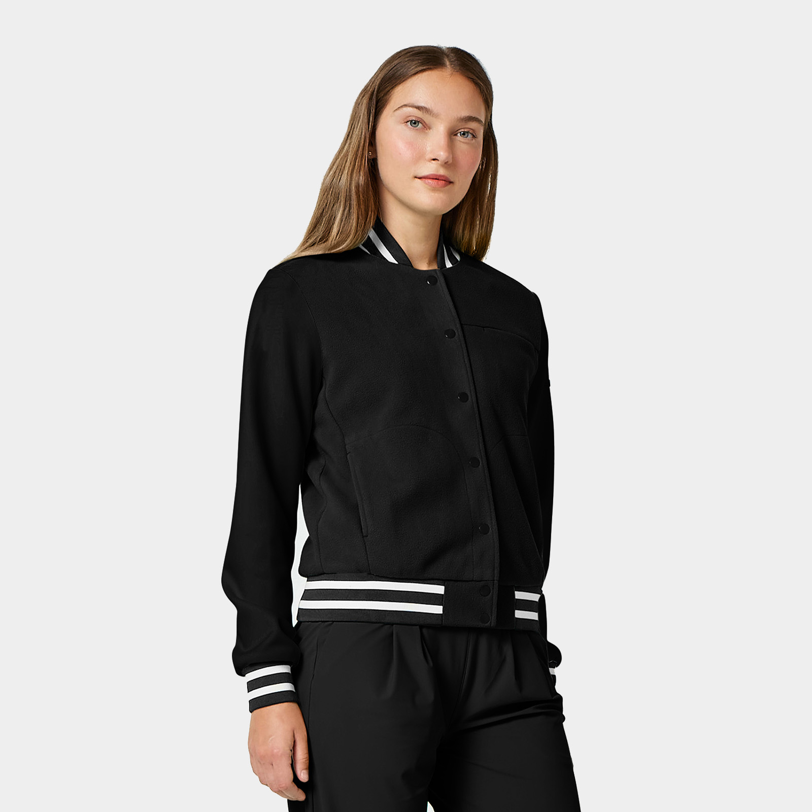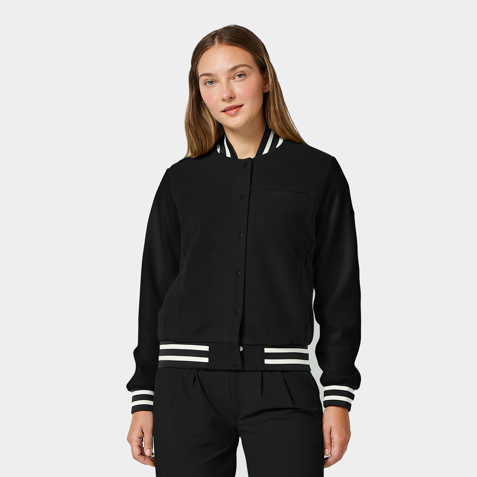 The Infinity Pursuit Women’s Varsity 3-Pocket Bomber Scrub Jacket blends retro sportswear style with workday comfort. With soft fleece, striped rib-knit trims, and three streamlined pockets, it delivers all-day warmth, stretch, and standout personality.