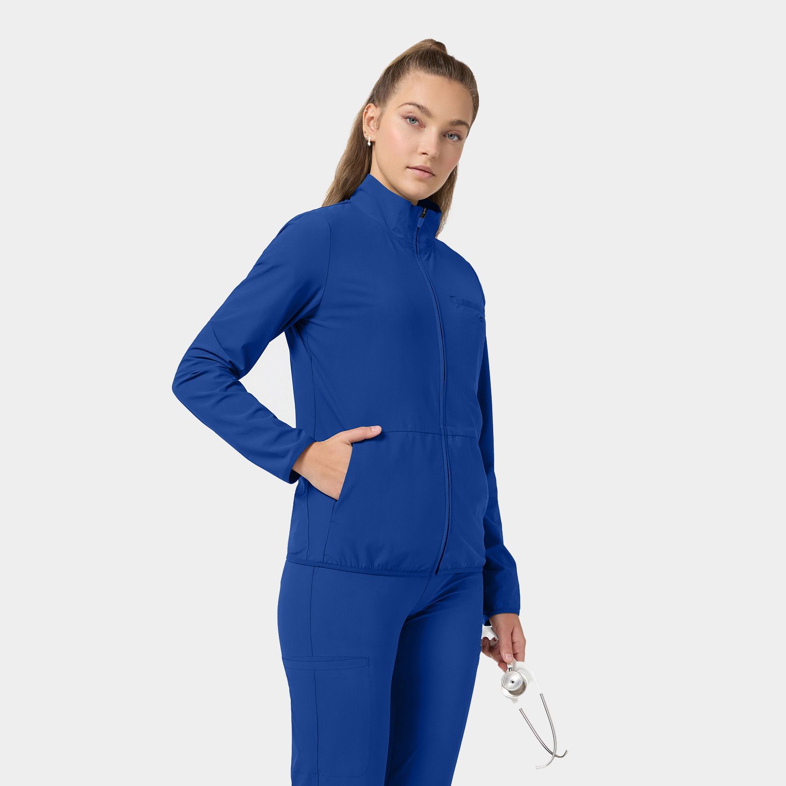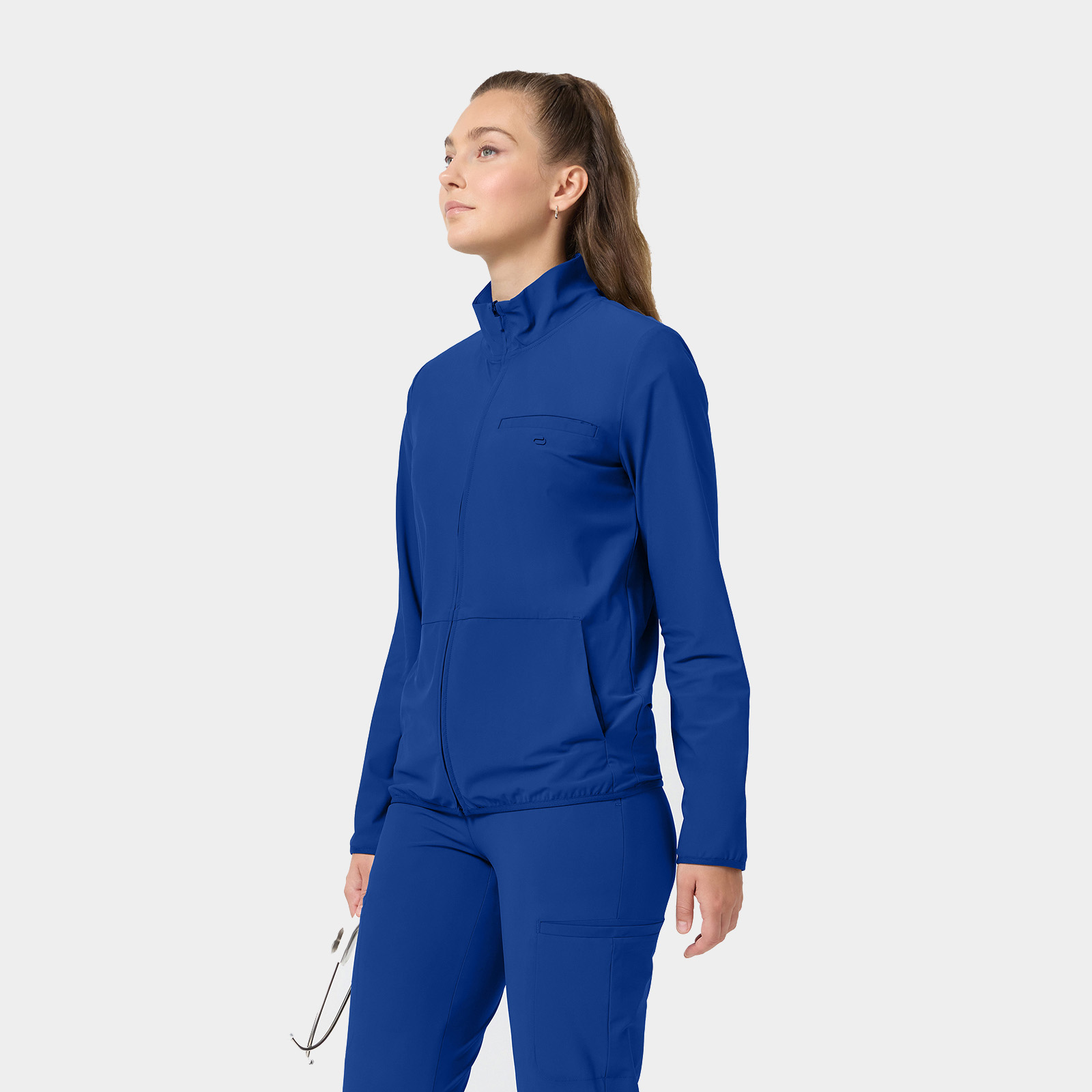 The Infinity Pursuit Women’s Zip Front 3-Pocket Warm Up Scrub Jacket delivers sleek structure, full coverage, and athletic comfort. With 360° stretch, moisture-wicking fabric, and PROTX2® odor control, it keeps you looking sharp and feeling fresh all shift long.
