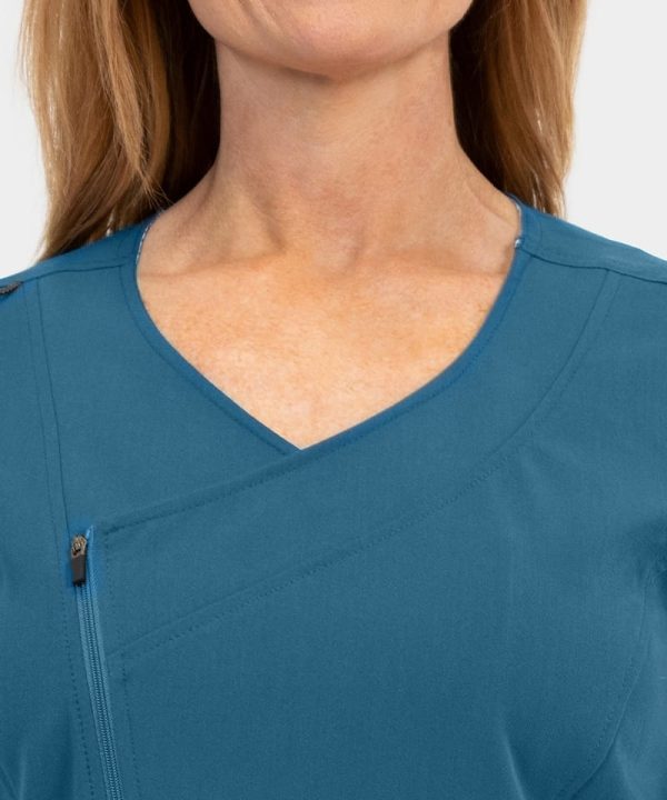 - Women’s dressy curved mock-wrap top with asymmetric front zipper
