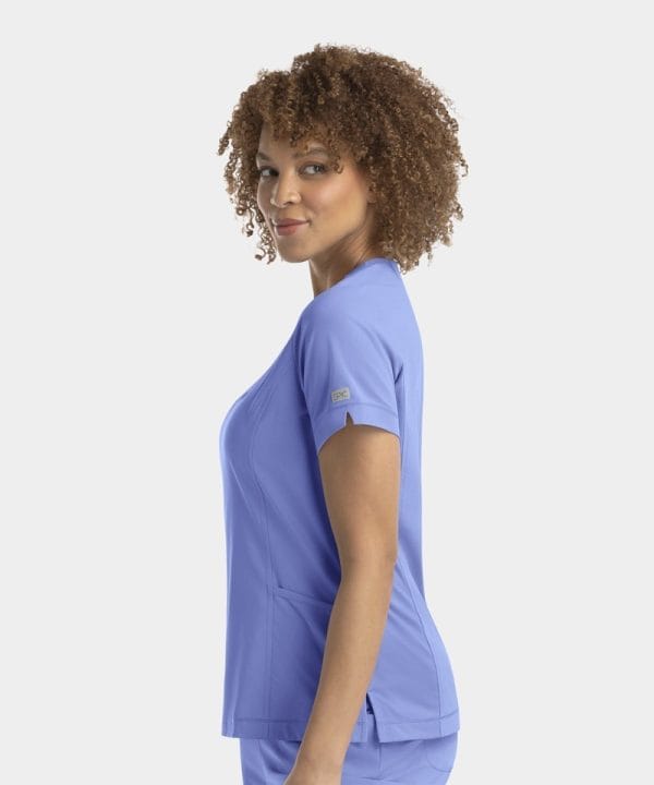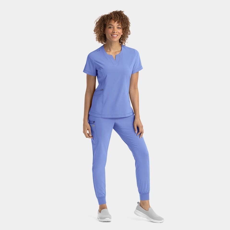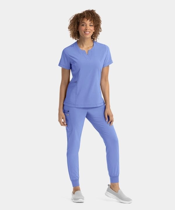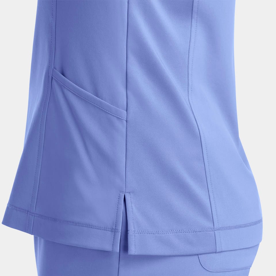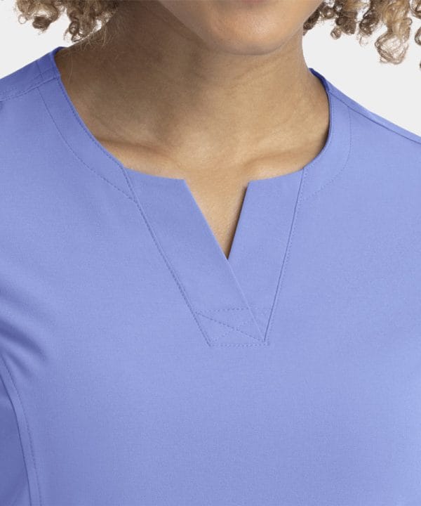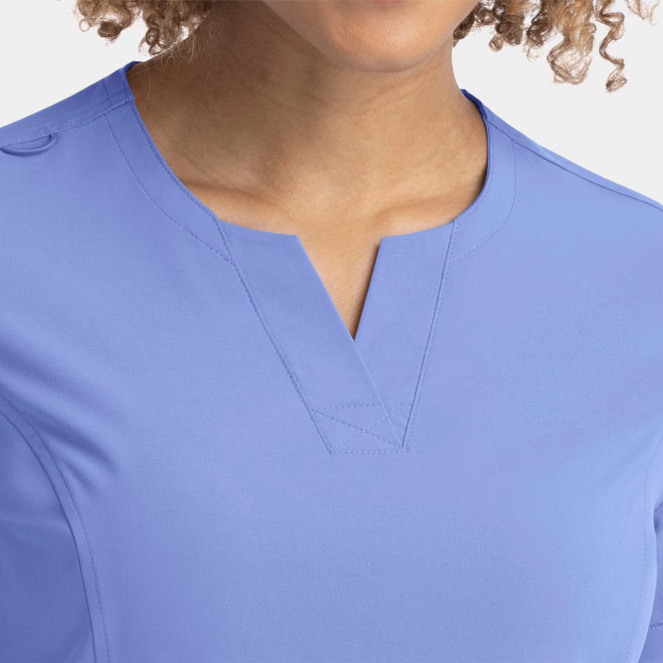Experience unmatched comfort in our women’s structured notched neck scrub top. Tailored with a handy bungee loop, zip cell pocket for today’s healthcare warrior, and flattering princess seams. The micro knit panel ensures ease through extended shifts, while the notched neck adds a stylish touch. Perfectly blending function with fashion!